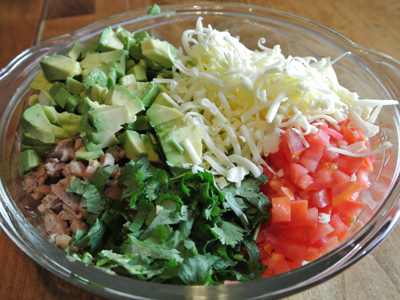 Cut the chicken into small bites. In a medium bowl combine chicken pieces, bacon bits, chopped tomato, avocado, cilantro and grated cheese.