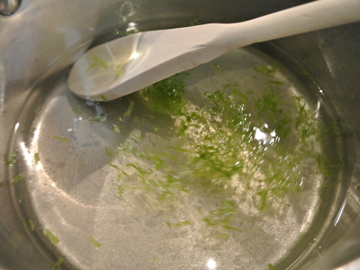 Continue stirring until it just begins to boil, turn down the heat and add the zest of one lime. Remove from heat and let syrup cool.