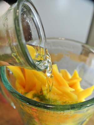 Along with the syrup, you’ll need 3 mangos, juice of 2 limes and a pinch of salt.