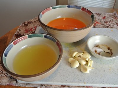The spices needed are Mexican oregano, a bay leaf, cumin powder, salt and white pepper. I peeled about 15 cloves of garlic to add also. Put the juice, garlic and spices in a blender and puree. Makes approx 2 cups.