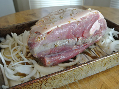 Rinse and pat dry the pork shoulder roast. Sprinkle 1 – 2 tablespoons salt over the roast and rub in generously. Cover and refrigerate overnight or at least 1 hour.