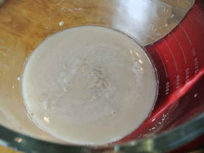 You can make the bread by hand right in the 5 quart bucket, which I sometimes do, but today I’m going to use my stand mixer to make the job a little easier. Mix together the water, yeast and salt. I have found that the dough seems to rise better and faster if I let the yeast ferment a few minutes before adding the flour, however the “master recipe” mixes it all at once.