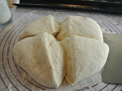 I used my pastry cutter to divide into 4 pieces. I will use 3/4 of the dough for my baguettes and rolls and leave the rest for later. Don’t know what I will try next but I’ve got 2 weeks to decide. And the longer the dough sits in the fridge, the more it takes on a sourdough taste.