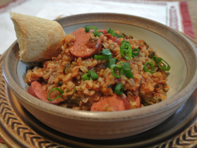 One of my favorite meals to make is Jambalaya. This one pot meal is easy to put together but doesn’t lack for flavor. Andouille may be the traditional sausage in Jambalaya but I find that the smoked sausage holds it own surrounded by spices, onions, garlic and wild rice. We usually break off a piece of crusty baguette to go alongside and call it a meal.