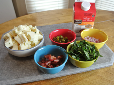 Chop the onion, jalapeno, tomato and spinach. Cube the cheese into small chunks.