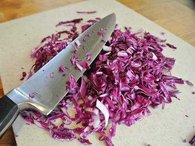 This recipe is for a head of cabbage about 1 1/2 pounds. Using a large knife take your cabbage and cut in half. Slice thin.