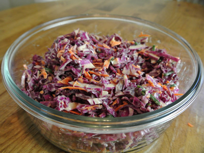 My Mom makes the best coleslaw but she doesn’t use a recipe that I know of. She adds a bit of this and that and tastes it, then a little more this or that until it passes the taste test. I’ve watched her make it enough times to memorize the ingredients so it’s just a matter of measuring out the right amounts of “this and that”. She probably uses Miracle Whip but I’m going with mayo, plus some cider vinegar, sugar, salt and some canned milk. She would pick a green cabbage but I’m going for color so I picked up a purple cabbage, carrot and green onion.