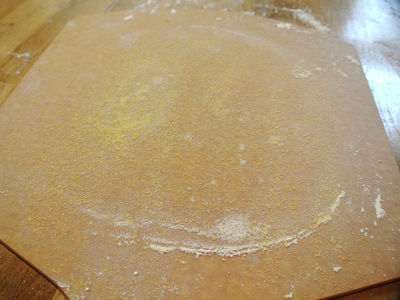 If using a pizza peel remove the dough and sprinkle some corn meal on the peel just before do the last roll.