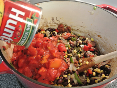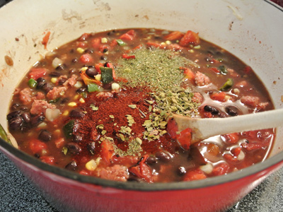 Heat a dutch oven over medium high heat. Add the sliced chorizo to the pot and drizzle olive oil if needed. Begin to brown the sausage in the pan. If too much grease cooks out of the chorizo sausage, drain the sausage and remove any excess oil from the pot. Stir in the chopped onion, garlic and peppers into the pot. Let them cook until they become soft and translucent. Next, add the beans, corn, tomatoes and chicken stock to the pot. Stir in the spices and bring just to a boil. Cover, turn down the heat and let simmer for 30 minutes to 1 hour.