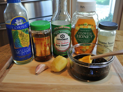 The marinade consists of some Sesame oil, Sambal Oelek chili paste,soy sauce, honey, garlic, and ginger. The sesame seeds come later.