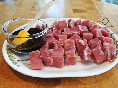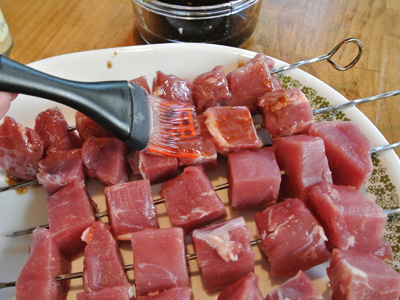 Mix all the marinade ingredients together and cut a 1 – 1 1/2 pound pork loin into 1 inch cubes. Skewer the pork. If using wooden skewers, make sure to soak them at least 20 minutes so they won’t burn when grilling.