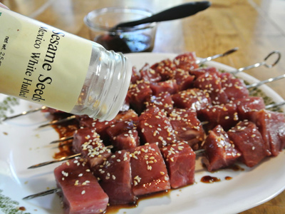 Then sprinkle some sesame seeds over the kabobs. No need to toast them ahead of time, they will toast while on the grill.