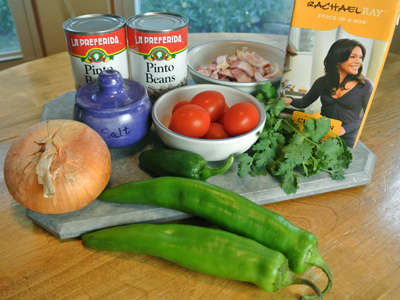 To this day my Mom still soaks a pot of dried pinto beans and cooks them in a pressure cooker. Me, I don’t have the patience and used canned pinto beans. Plus some chicken stock, bacon, onion, green chile, jalapeno, tomato, cilantro and salt.