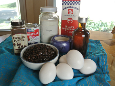 I used evaporated milk, sugar, whole coffee beans, egg yolks, heavy cream, salt, vanilla, and espresso powder.