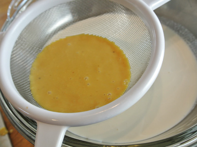 Once the mixture has steeped for an hour it’s time to bring out the heavy cream. Set a bowl inside of a larger bowl filled with a few ice cubes. Place a mesh strainer over the top bowl and strain the cream.