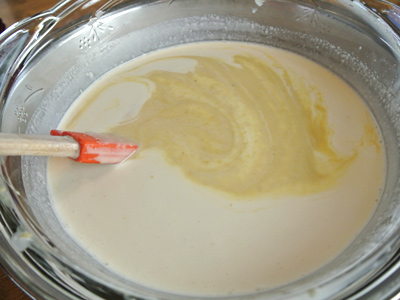 That will keep the cream cool while I get started on reheating the milk and coffee bean mixture.