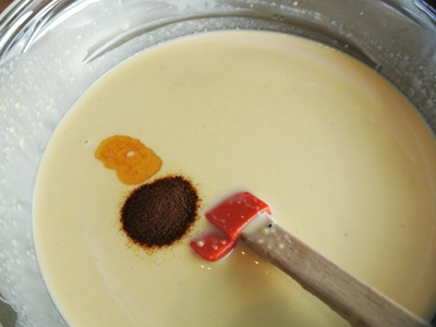 Slowly begin pouring the warmed milk mixture into the egg yolks, whisking constantly to temper the eggs but not cook them. Back into the sauce pan to reheat over medium high heat. Stir constantly until the mixture coats the back of a wooden spoon.