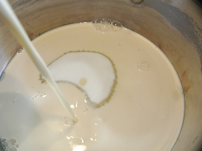In a medium saucepan combine the evaporated milk and sugar and salt. The original recipe calls for 3/4 cups of sugar. I would cut back to 2/3 cup next time as I thought it was just a tad bit sweet for my taste.