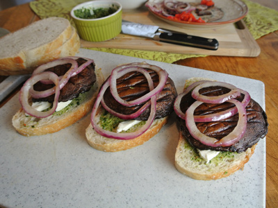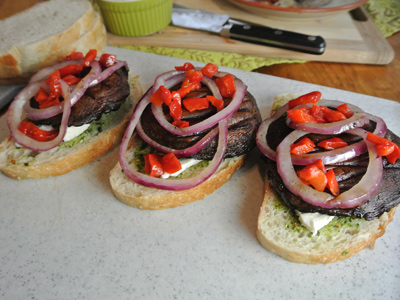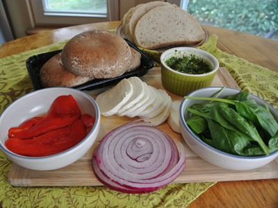 Set out 3 slices of sourdough bread.  Lightly spread pesto over bread and add a layer of fresh mozzarella cheese.  Layer with the portabella mushroom, onion slices and diced red pepper.  Top with a few spinach leaves, another layer of fresh mozzarella and top with the remaining 3 slices of bread.
