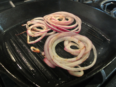 I set the onion slices in the same grill pan, drizzled with olive oil with a little salt and pepper.