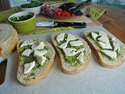 Time to put the sandwich together.  I had 3 portabella’s so I’m making 3 panini’s.  Lightly spread pesto over 3 slices of sourdough bread.  Arrange a layer of fresh mozzarella so that the cheese will melt evenly over the sandwich.