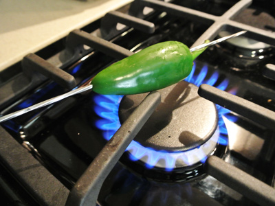 In just a few minutes it begins to char and blister.  Place in a plastic bag and seal for 20 minutes to steam.  Then peel under running water.