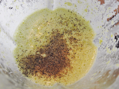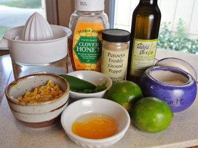 Along with the roasted jalapeno you’ll need some roasted corn (which I had previously roasted), some honey, an egg yolk, lime juice, olive oil, salt and pepper.
