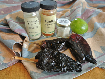 Time to put the spice blend together.  The recipe calls for chili powder but I don’t do commercial chili powder.  Once I found Paul Prudhomme’s method for picking the right dried chiles and blending with other spices I make my own chili powder.  I chose to grind Ancho chiles and NM Red chiles, add some garlic powder, paprika, green chile sea salt and lime zest.  *Any sea salt will do, but the flavored sea salts will taste fantastic here.