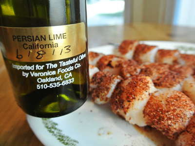 Place 6 scallops to each skewer.  Drizzle with olive oil, Persian Lime is a good choice.