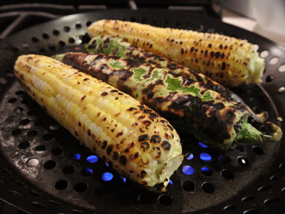 It was raining outside and no way to roast my chiles and corn outdoors/  I improvised and set my grill pan over an open burner on the stove.