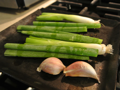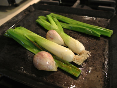 I cut the green onions in half so that they would fit on my comal. Drizzle olive oil over the onion and garlic. Heat over medium high heat for several minutes.