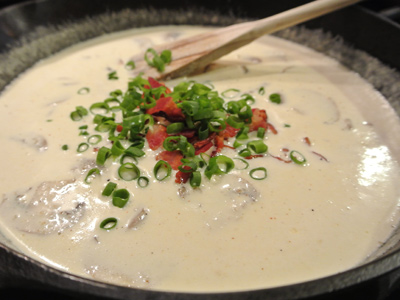 To make the cream sauce, first melt the butter in a heavy skillet. Once the butter has melted, add the flour and stir over medium high heat to make a roux. Add in the sliced mushrooms and let cook a few minutes while they begin to soften and release their juices. Pour in the heavy cream, creole seasoning and cayenne pepper. Stir until the sauce begins to thicken. Add in the cooked bacon bits, green onion slices and crawfish tails. Salt to taste.