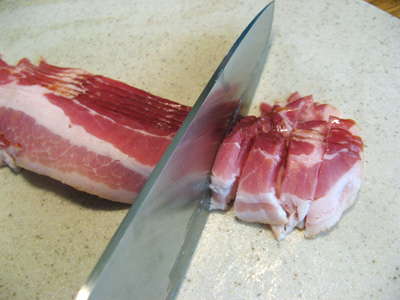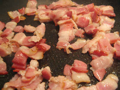 I took 6 slices of bacon and sliced them into smaller pieces.