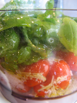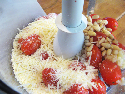 I usually put pesto together by testing and tasting so feel free to add more or less of any ingredient except the cherry tomatoes, they are most important. I used a pint of cherry tomatoes, basil leaves, pine nuts, a blend of Pecorino Romano, Parmesan and Asiago cheese, fresh garlic, olive oil, salt and pepper.