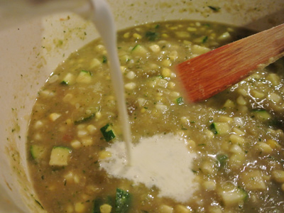 Add in the reserved green chile, 1/2 cup of finely chopped zucchini and 1 cup of freshly cut corn.