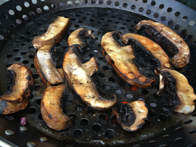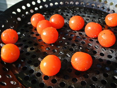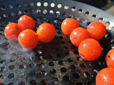 Heat up a gas grill. Drizzle veggies with olive oil and sprinkle with salt and pepper. Grill onion, zucchini, and mushrooms, turning often until they are soft and tender. Look for some slight charring on the outside. Roast the cherry tomatoes until the skin begins to split and they begin to char slightly. Let the tomatoes cool for a few minutes, then slice in half.