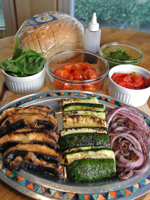 Now that I have my glaze made I can assemble the rest of the panini ingredients. Sourdough bread was my bread of choice, plus some sliced portabella’s, sliced zucchini, sliced red onion, cherry tomatoes, fresh spinach leaves and pesto. Also, I found some roasted red pepper in the freezer for Joe.