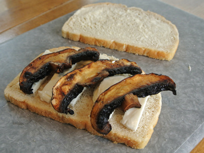Time to assemble. Butter each slice of sourdough bread which will go face down on the hot griddle. Layer one slice with some fresh mozzarella slices and a layer of portabella slices.