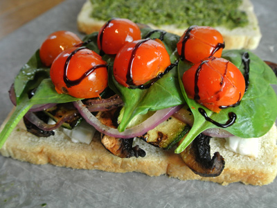 A layer of roasted cherry tomatoes and a drizzle of balsamic glaze. Spread a layer of pesto on the other slice.