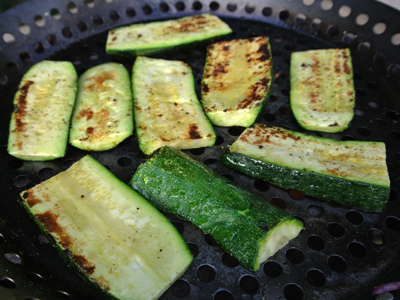 Same thing with the zucchini slices . . . olive oil, salt and pepper. These will take a few more minutes than the onions. Flip every 2 minutes to avoid burning.