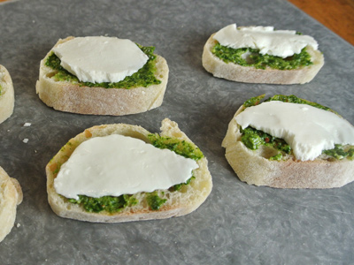 I always make more pesto than I need for one meal so I have to come up with other ways to use it. One of my favorites is Crostini’s with fresh mozzarella and chopped tomatoes. I had a pint of heirloom tomatoes in the fridge and thought how colorful and pretty they would look propped up on a sliced french baguette. They are the perfect companion to any pasta dish and a leafy salad which I’m working on for dinner tonight.
