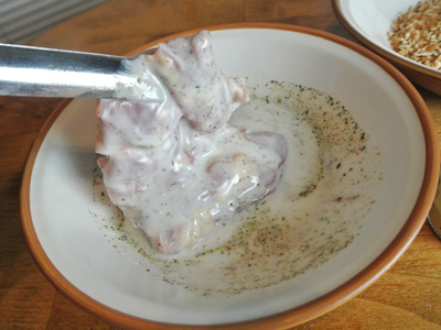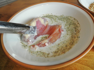 Very simple ingredients. Some crumbs of your choice (I used Pretzel Crisps), buttermilk and buttermilk ranch dressing mix. I used boneless skinless thigh meat but you could use boneless chicken breasts as well.