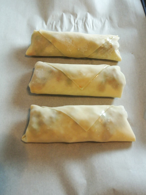 Line a baking pan with parchment paper to lay the egg rolls on until it’s time to fry. Got the first 3 made, the rest will go quickly.