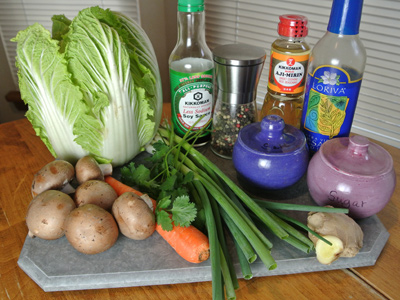 You can mix and match a variety of veggies for egg rolls. I went with a head of Napa cabbage, some baby portabellas, a carrot, some green onion, cilantro and fresh ginger. The sauce and seasoning consists of soy sauce, Chinese rice wine, sesame oil, salt, sugar and black pepper.