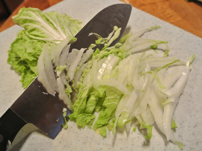 I separated the leaves of cabbage and rinsed them first. Finely slice them with a sharp knife and then cross cut to make a fine chop.