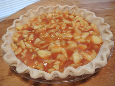 This pie needs 6 – 7 cups of apples. I’ll leave it up to you which kind of apple you like in your pie. I picked up some Braeburn apples this time. You’ll also need a mix of brown sugar, white sugar, salt and flour along with cinnamon, nutmeg, vanilla extract, lemon juice, butter and salted caramel sauce. You can half this recipe to fill a 1/2 pint jar of caramel sauce, plenty for the pie and extra to drizzle as a topping.