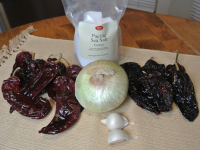 I am using some Ancho and Guajillo chiles for the sauce and also to grind for seasoning.  Also an onion, garlic cloves and salt.