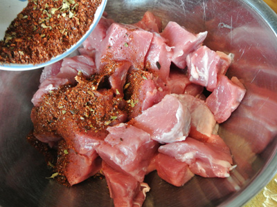 Mix the spices together and sprinkle over the meat.  Mix it in so that the pork is covered in the spice mix.