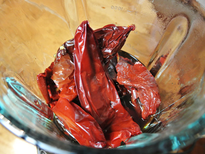 The red chiles are now sufficiently soaked and soft.  Remove the chiles from the reserved water and place in a blender. Add 2 cups of the reserved chile water to the blender and puree.