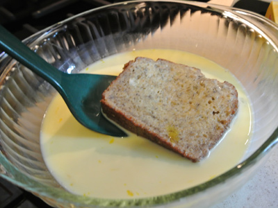 Whisk the mixture and then dip each slice into the egg bath. Let sit a few seconds on each side, enough time to let it soak slightly into the bread.